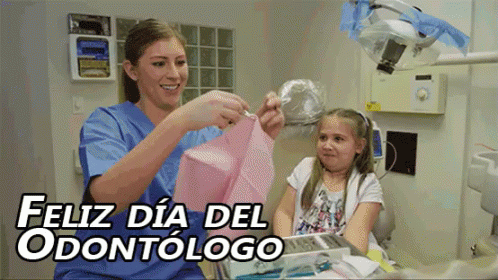 Dental assistant gives a gift to a little girl in a dentist's office, celebrating Dentist's Day.