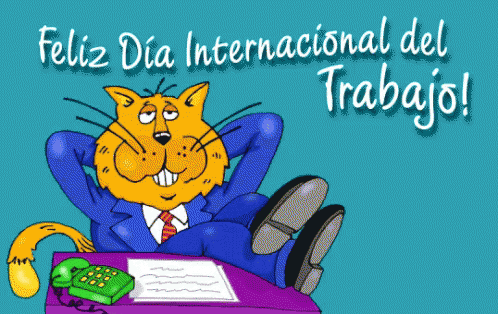 Cartoon cat relaxing at a desk with feet up, celebrating International Labor Day with a message to take a break.