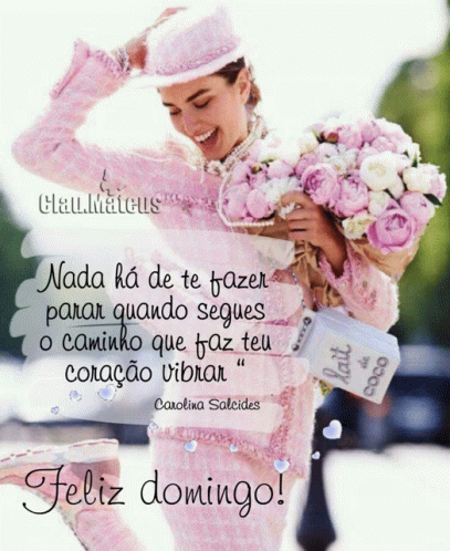 A smiling woman in a pink outfit holding a bouquet of flowers, with a motivational quote and 'Happy Sunday!' greeting.