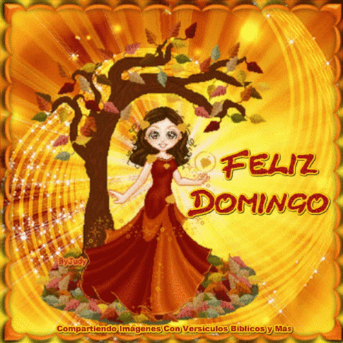 An animated greeting featuring a girl under a glowing tree, wishing a "Happy Sunday" (Feliz Domingo).