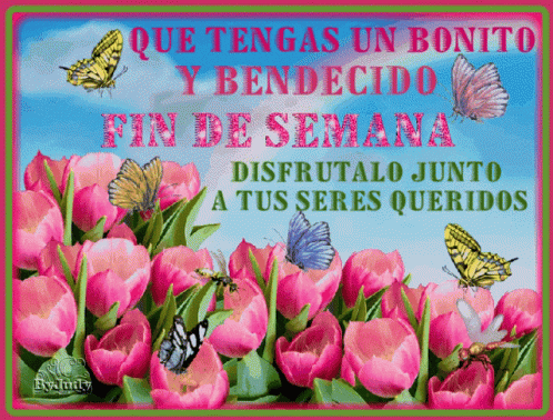 A vibrant greeting card with pink tulips and butterflies, wishing a happy and blessed weekend in Spanish.