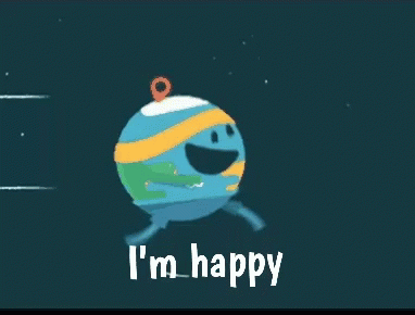 Animated happy planet character runs through space, declaring 'I'm happy' with a cheerful sun.