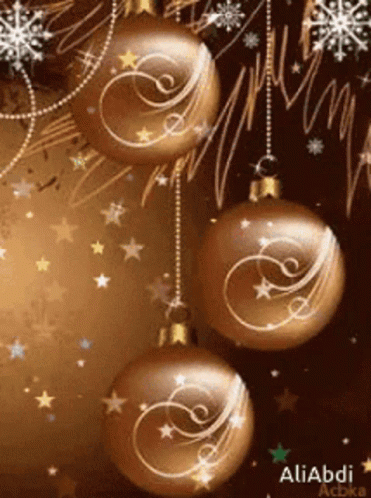 Animated golden Christmas ornaments sparkle with snowflakes, creating a festive holiday atmosphere.