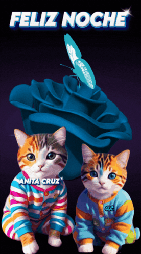 Two adorable cats in pajamas, one named Anita Cruz, wishing a Feliz Noche with a blue rose and butterfly.