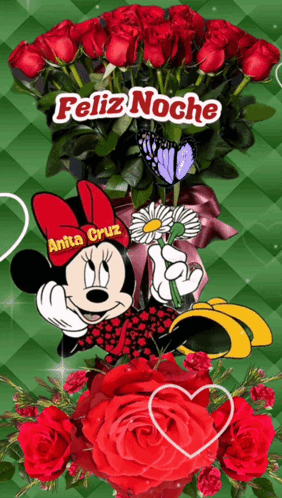 Minnie Mouse wishes Anita Cruz a Feliz Noche with a beautiful bouquet of red roses and a daisy.