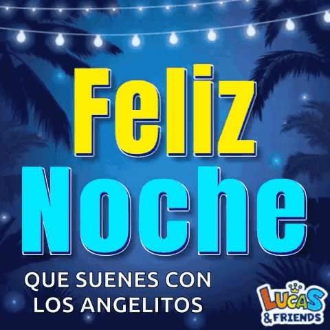 A vibrant graphic wishing 'Feliz Noche' (Happy Night) and 'Que Sueñes con los Angelitos' (Dream with little angels) from Lucas & Friends.