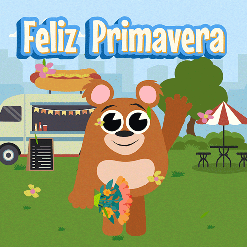 A cheerful cartoon bear waves and holds a bouquet of flowers, celebrating spring in a park with a food truck.