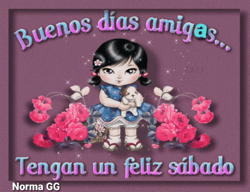 A sweet image featuring a girl holding a puppy, adorned with flowers and sparkles, wishing 'Happy Saturday, Good Morning Friends'.