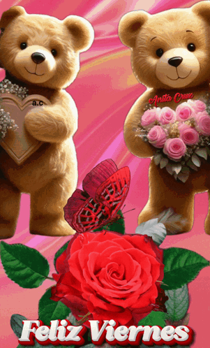 Two adorable teddy bears, one holding a heart and the other flowers, with a 'Happy Friday' message.