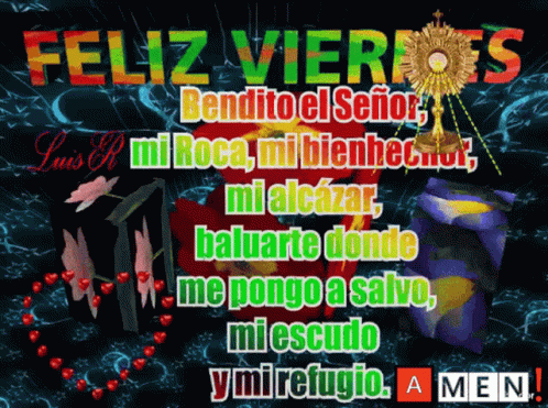 A vibrant graphic with a Spanish prayer for a Happy Friday, praising the Lord as rock and refuge.