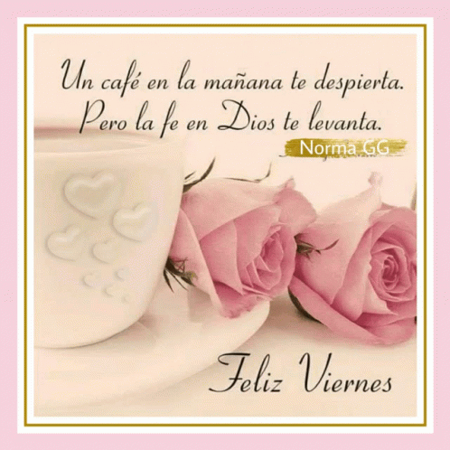 A beautiful image with a coffee cup, pink roses, and a Spanish message about faith and a happy Friday.