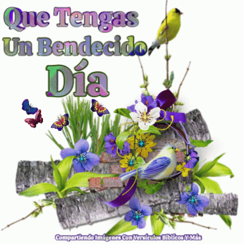 A vibrant image wishing a blessed day, featuring colorful birds, butterflies, and flowers.