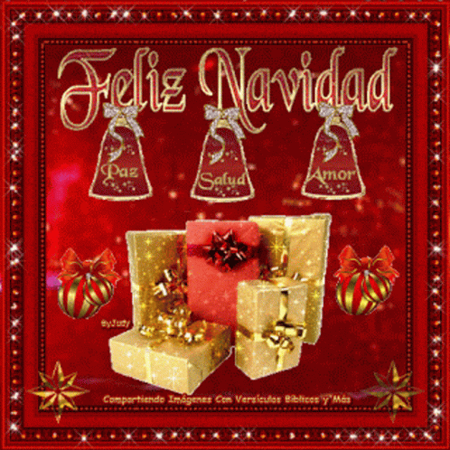 A festive Christmas card featuring 'Feliz Navidad' in gold script, along with gifts and holiday wishes.