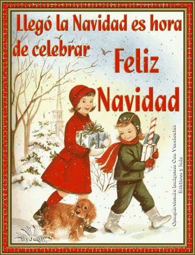 Two children and a dog walk in a snowy landscape, carrying Christmas gifts, celebrating the holiday season.