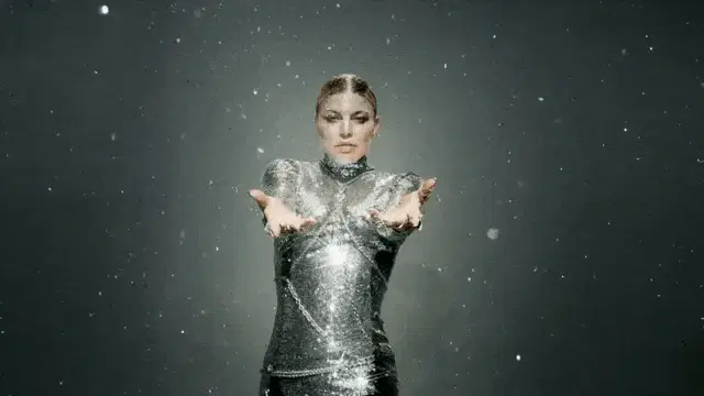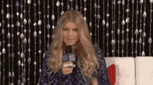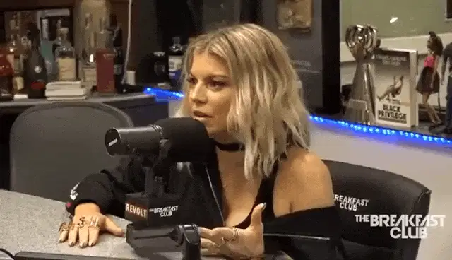 Fergie enthusiastically says 'YAAAAAAAS!' while pointing and smiling in a vibrant yellow setting.