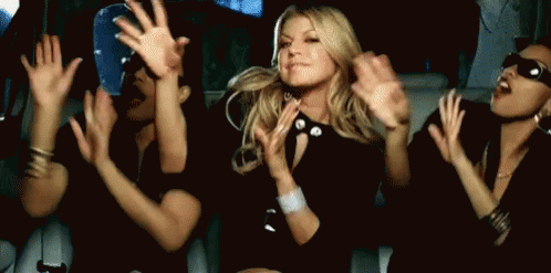 Fergie and backup dancers showing energetic moves in a car, wearing sunglasses and black outfits.