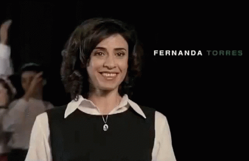Fernanda Torres smiles, holding her hands to her chest, from 'Saneamento Básico'.