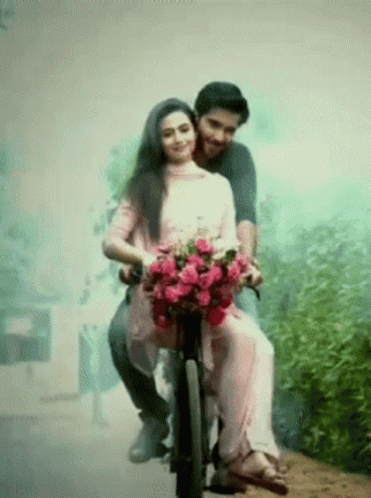 Feroze Khan and Sana Javed share a romantic moment on a bicycle, with Sana holding a bouquet of pink roses.