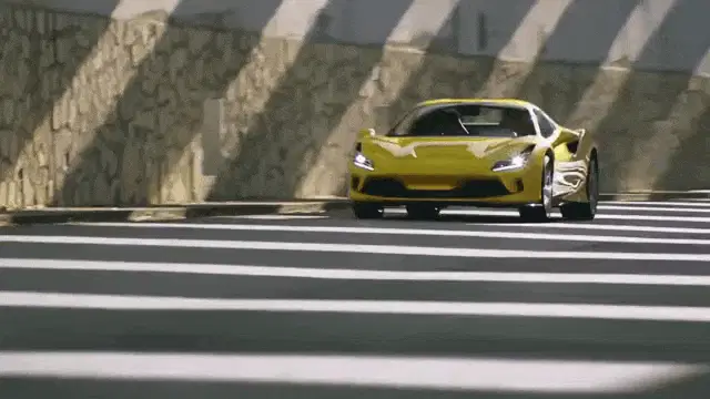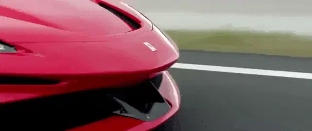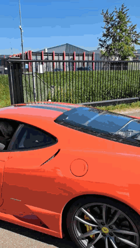 An orange-red Ferrari F430 supercar drives away on a sunny day, showcasing its sleek design and powerful rear.