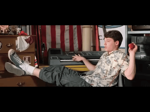 Ferris Bueller, played by Matthew Broderick, relaxes in his room, holding an apple.