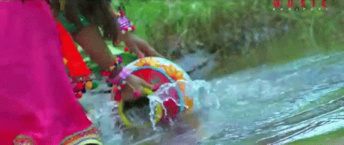 Kajal Raghwani, in a vibrant pink dress, gracefully fetches water from a stream with a traditional pot, embodying a cheerful spring scene.