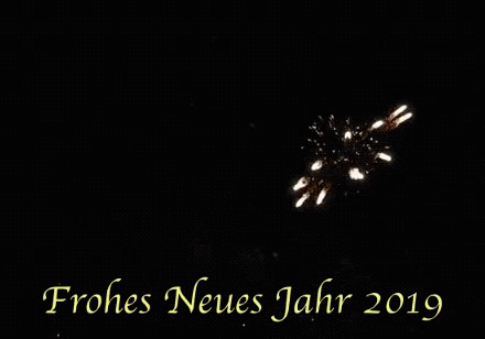 Spectacular fireworks light up the night sky, celebrating 'Frohes Neues Jahr 2019' (Happy New Year).