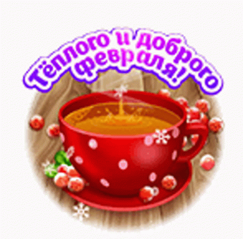 A cozy red cup of hot tea with berries and snowflakes, wishing a warm and kind February.