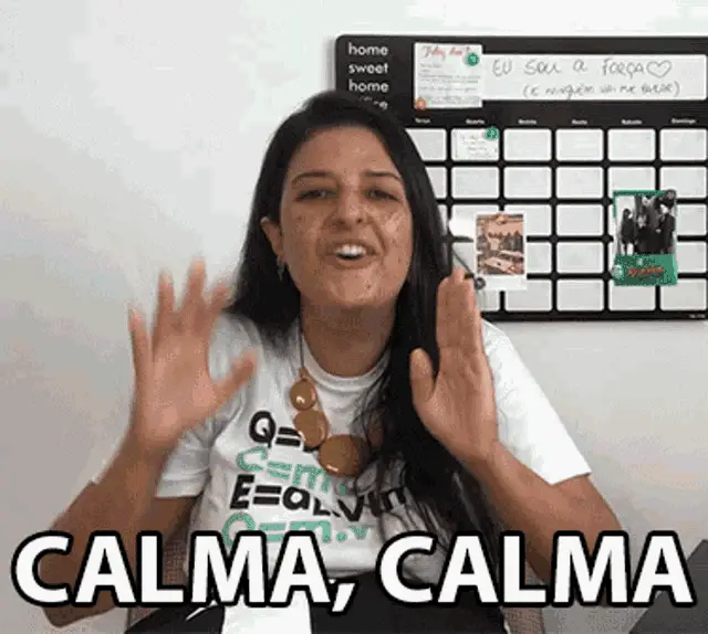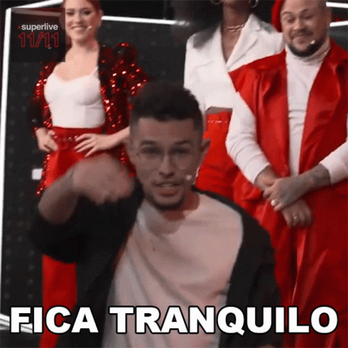 Jotinha, smiling and gesturing, stands in front of the 'Fica Tranquilo' sign during the Singles Day event.