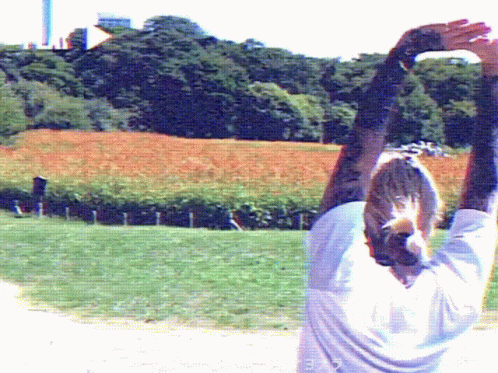 Genki Takebuchi raises her arms in a field, celebrating the moment.