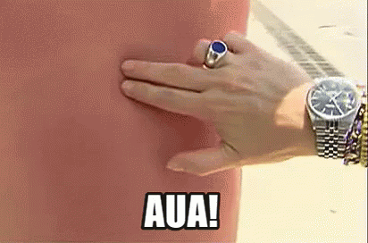 A hand with a ring and watch pokes a visibly sunburned stomach, eliciting an 'Ouch!' reaction.