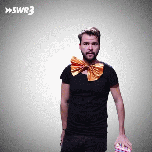 Sebastian Mueller celebrates his birthday with a surprise gift and cake, wearing an orange bow tie.