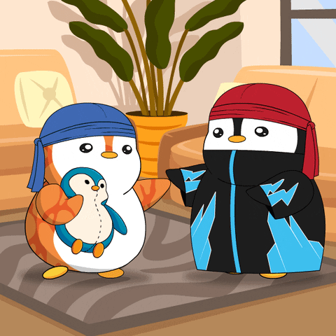 Two animated Pudgy Penguins, one in a blue headband and one in a red, playfully fight over a small penguin toy.