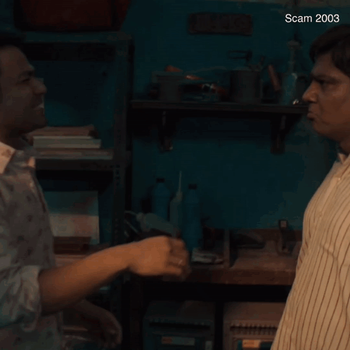 An intense argument between two men from Scam 2003, featuring the insult 'Saale Ghanta Tu Hai'.