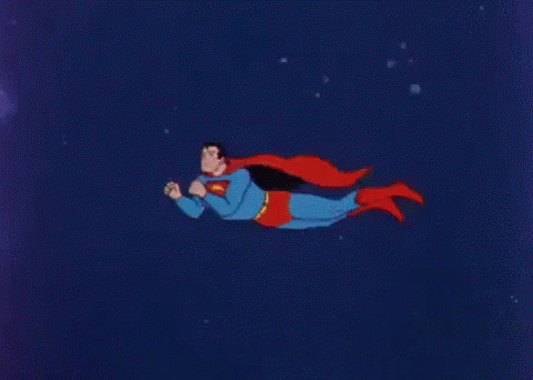 Superman flies through the air, his red cape flowing, as orange, carrot-like projectiles surround him, fighting chemo radiation.