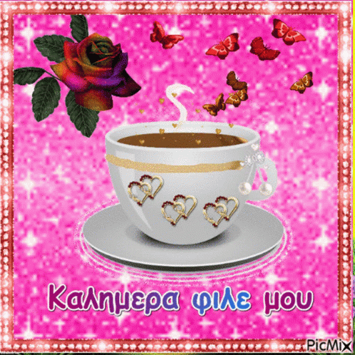 A vibrant good morning greeting featuring a coffee cup, rose, and butterflies on a sparkling pink background.