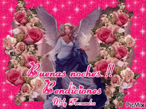 Angel surrounded by pink roses with a 'Good Night, Blessings' message from Mily Fernandez.