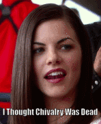 a woman with long hair is smiling and says `` i thought chivalry was dead '' .