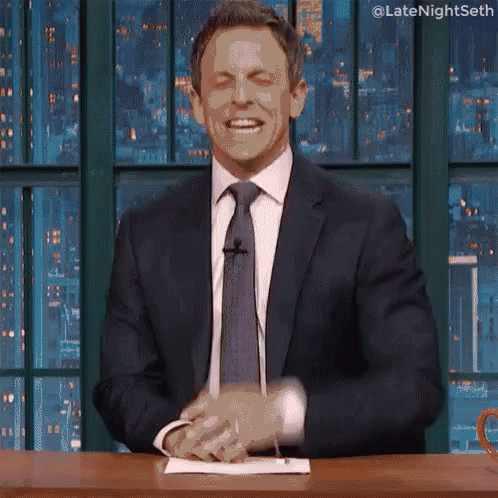 A man in a suit celebrates with a fist pump, exclaiming "Finalmente" (Finally) on a talk show set.