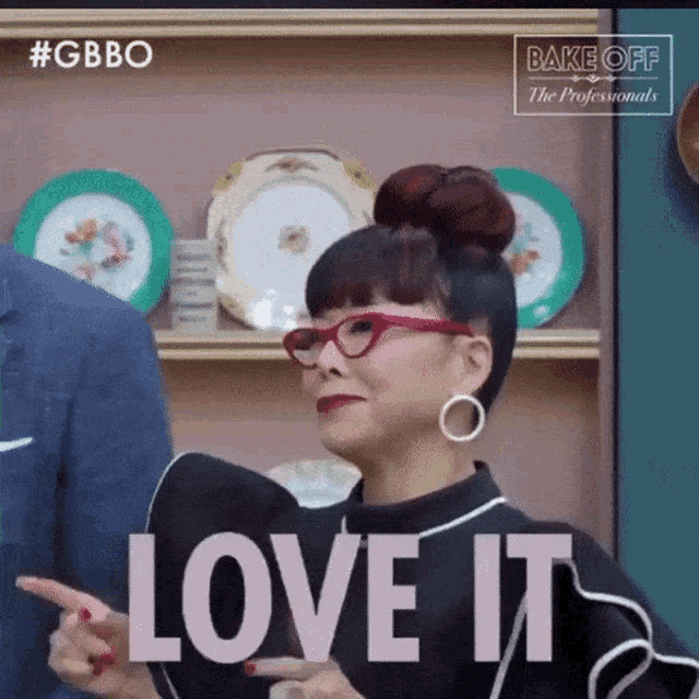 Cherish Finden from Bake Off: The Professionals enthusiastically points, exclaiming 'LOVE IT!'