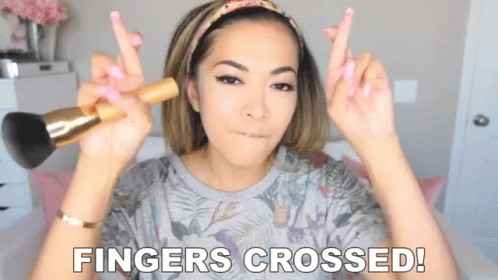 Heart Defensor crosses her fingers, expressing hope while holding a makeup brush.