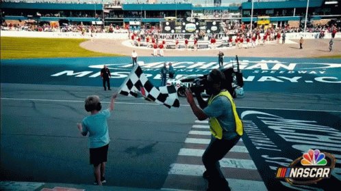 A young boy waves a checkered flag at the finish line of a NASCAR race, captured by a cameraman.