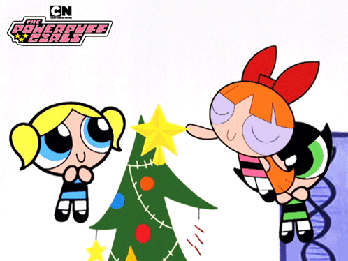 Blossom, Bubbles, and Buttercup from Powerpuff Girls decorating a Christmas tree.