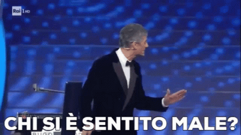 Fiorello on stage asking 'Chi si è sentito male?' during the Sanremo festival, referencing the famous moment.
