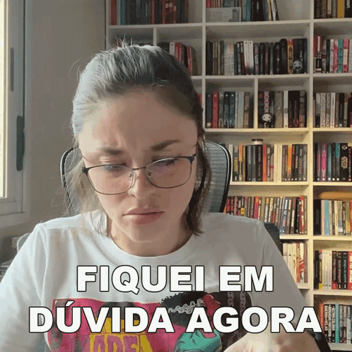 Joice Cardoso, wearing glasses, expresses doubt in front of a bookshelf, with the caption 'Fiquei Em Dúvida Agora'.