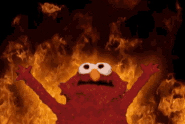 Elmo from Sesame Street stands with arms raised, engulfed by intense flames in a dramatic and humorous meme.