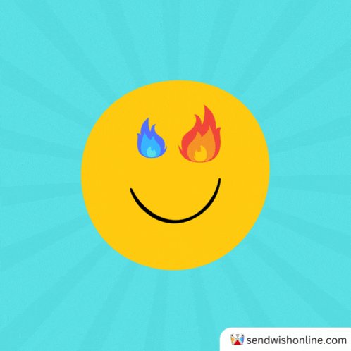A vibrant yellow smiley face emoji with a red flame in one eye and a blue flame in the other.