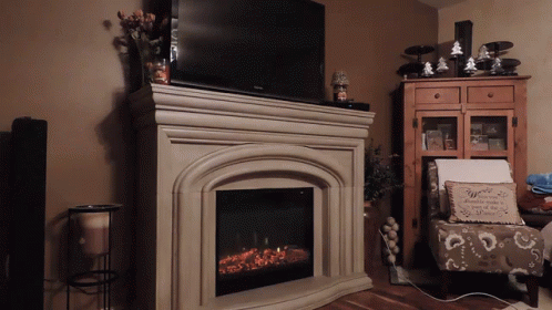A warm and cozy living room featuring a fireplace with artificial flames, a television, and an armchair.