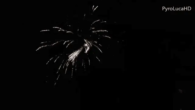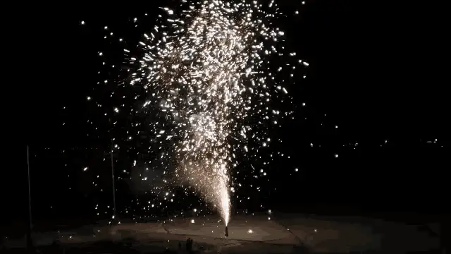 A vibrant firework display illuminates the night sky with colorful explosions and smoke, featuring various shell types.