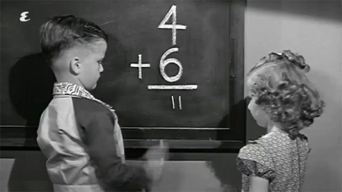 Children at a blackboard with an addition problem, while a study claims first-borns are smarter than siblings.
