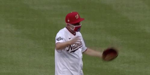 Dr. Anthony Fauci throws the ceremonial first pitch for the Washington Nationals, wearing a team jersey and face mask.